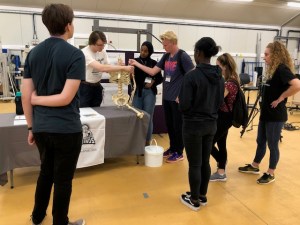 Students examined 3D printed fossil specimens, as well as the bones of modern birds and crocodilians, to see how the bones are connected and how different joints have different ranges of mobility. They had fun looking at bone models (archosaur and human) and examining muscle scarring on the 3D printed and real bones. Students also learned how muscles work in lever systems and did muscle leverage exercises with the human arm model and the bucket lift challenge.