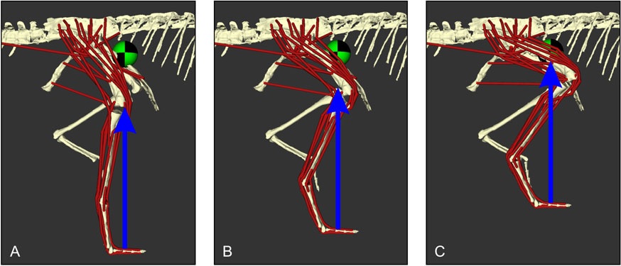 Finally, we used open-source, well-vetted biomechanics software OpenSim to simulate what speeds the hindlimb musculature could have sustained. First, we found that applying this method to good models of a human and ostrich in sprinting poses gets the “correct” conclusion that they could indeed run that way, although with the interesting finding that their knee muscle strength, not ankle muscles as our prior studies had inferred, might be the major limit on speed.
