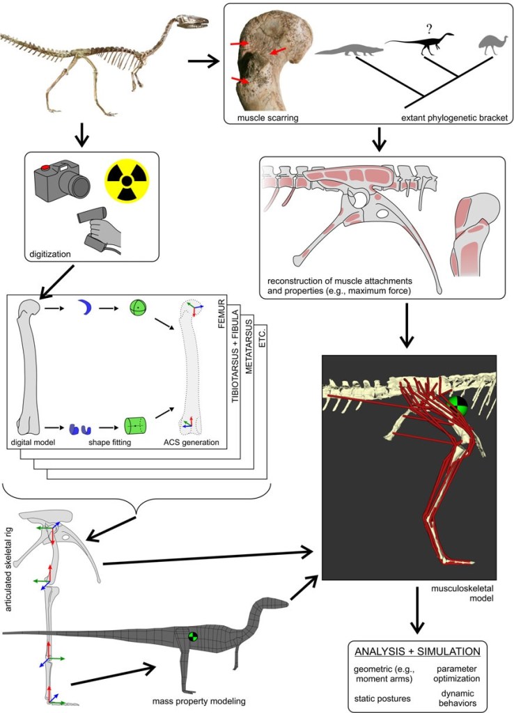 The second paper laid our a new refined method for building 3D computer models of whole archosaurs, including reconstructed muscles, and used this method to estimate how fast the bipedal Triassic dinosaur Coelophysis might have run. We explained how we go from 3D scanned bones to an articulated, skeletal “digital puppet”, providing new tools to do this more objectively by semi-automatically defining joint surfaces using the bony geometry. Next, we provided an outline of how one “fleshes out” the skeleton, adding masses and centres of mass and inertia, as well as then providing muscular attachments and connecting those to create a full-fledged 3D musculoskeletal model. Such a model can then be given physiological properties based on its anatomy and data from living animals, for which we gave new methods to do so.