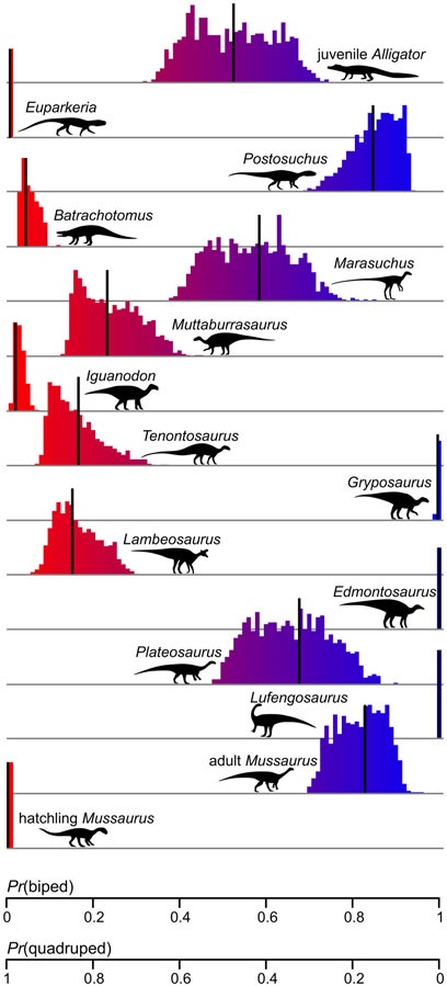 We also had some non-Triassic/Jurassic species in our sample that produced interesting results. Broadly, we obtained good support for the conclusion that “duckbill” ornithopod dinosaurs (Muttaburrasaurus, Tenontosaurus, Iguanodon, Lambeosaurus) were usually quadrupedal, as their hooved “hands” and fossil footprints strongly indicate; but two species (Gryposaurus and Edmontosaurus) ended up (mis)classified as bipeds; a result that analogous methods based on bone dimensions also tend to get. Hence we suspect that simply relying on parameters such as these studies’ to estimate locomotor posture is insufficient. Ornithopods had unusually short, skinny forelimbs that seem to mislead such analyses.