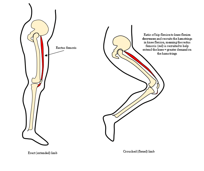 When we crouch our legs, we are limiting the full range of motion of our muscles, and shortening the distance between the fulcrum and applied force which means that many of the leg’s lever arms are generally getting smaller. As a person begins to crouch, the knee flexion lever arm increases whereas the hip lever arm does not change much. The ratio of hip flexion lever to knee flexion lever decreases, making the hamstrings relatively stronger knee flexors. The rectus femoris (shown below) is recruited to help extend (straighten) the knee. Unfortunately, this muscle is also a powerful hip flexor and thus places a higher demand on the hamstrings to extend the hip. This, in turn, produces further flexion at the knee. As higher knee extension forces are required, this will lead to increased energy consumption of the thigh muscle group and will eventually lead to an inability to continue walking in such a manner. This is why your muscles will start to feel fatigued and cramped if you walk with a crouched gait for prolonged bouts of movement.